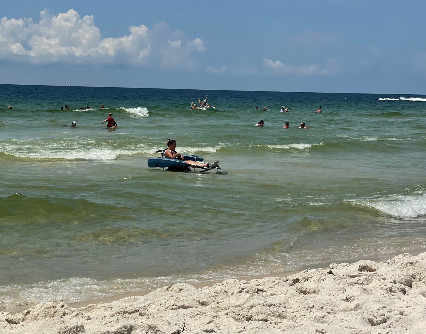 The frame caught my eye first. It had the appearance of a burly off-road trike. The elongated metal triangle was mounted on some of the biggest tires I’d ever seen on the beach. Seated in this oversized tricycle was an adult woman. Her mounted plastic chair enveloped her, looking like it had been molded to protect her supine position. Her arms were draped over bulky armrests. Her legs were stretched out before her. Her feet were strapped in place on foot rests.